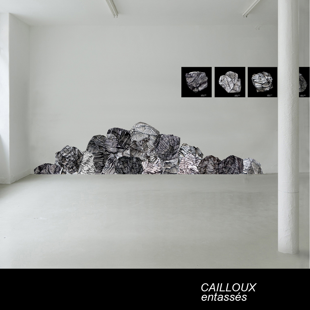 cailloux 2022-2024 Les "cailloux" sont destinés à être un jour entassés, cassés, dépliés ou oubliés. Les "cailloux dépliés" sont des dessins réalisés entre 1981 et 1984. Les "effondrements" sont des cailloux entassés.